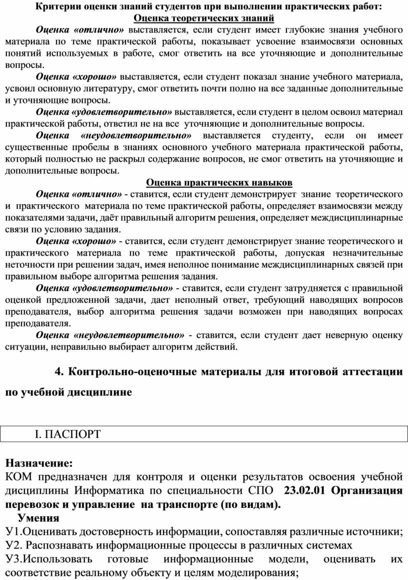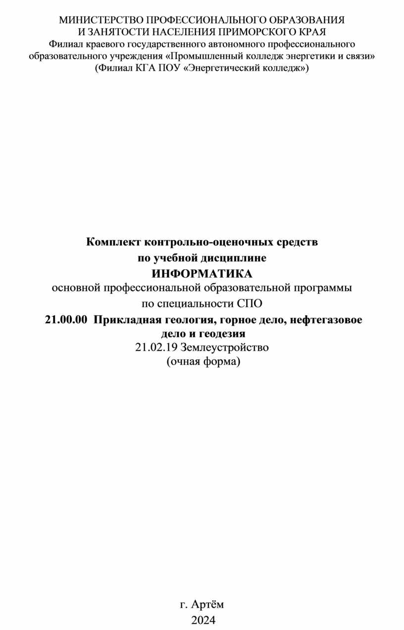 Комплект контрольно-оценочных средств разработан на основе Федерального государственного образовательного стандарта среднего профессионального образования по специальности СПО 21.02.19 Землеустройство, программы учебной дисциплины «Информатика»
