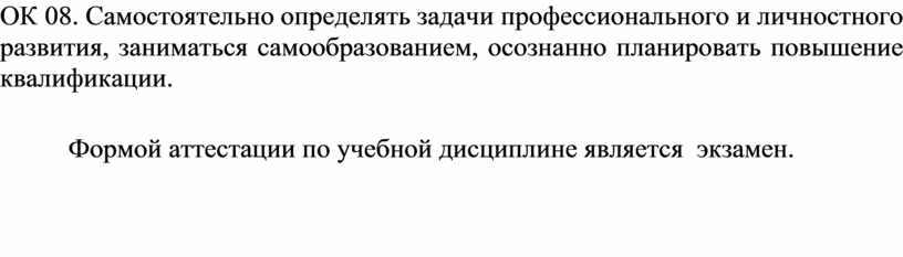ОК 08. Самостоятельно определять задачи профессионального и личностного развития, заниматься самообразованием, осознанно планировать повышение квалификации.