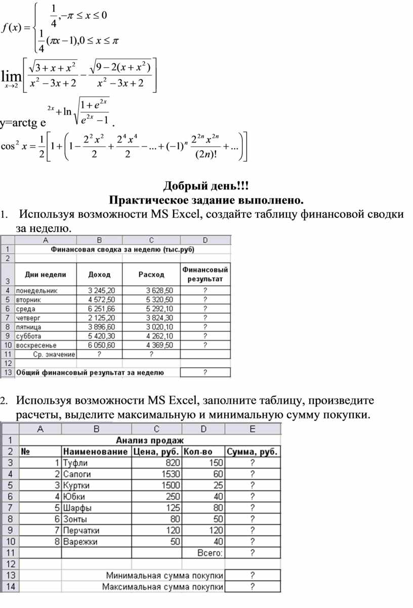 12. Используя возможности MS Excel, заполните таблицу, произведите расчеты, выделите максимальную и минимальную сумму покупки.