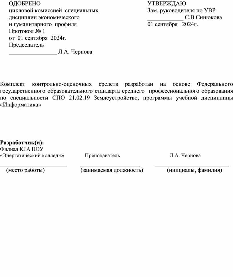 ОДОБРЕНО цикловой комиссией специальных дисциплин экономического и гуманитарного профиля Протокол № 1 от 01 сентября 2024г. Председатель ________________ Л.А. Чернова
