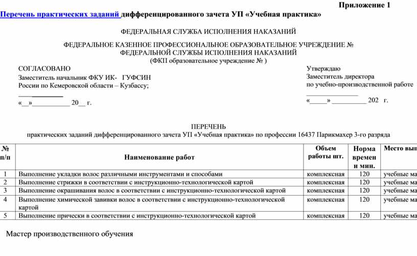 Приложение 1 Перечень практических заданий дифференцированного зачета УП «Учебная практика»