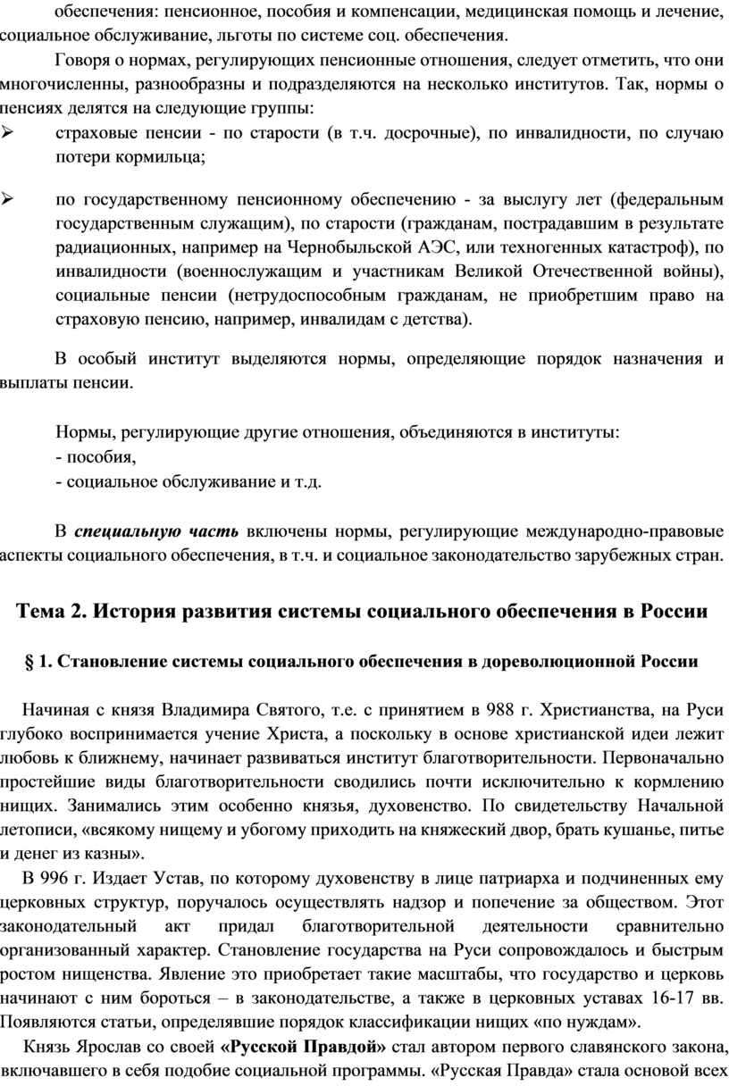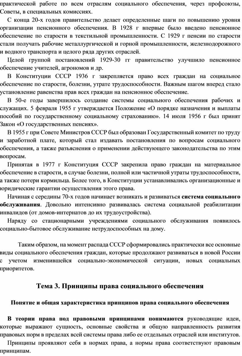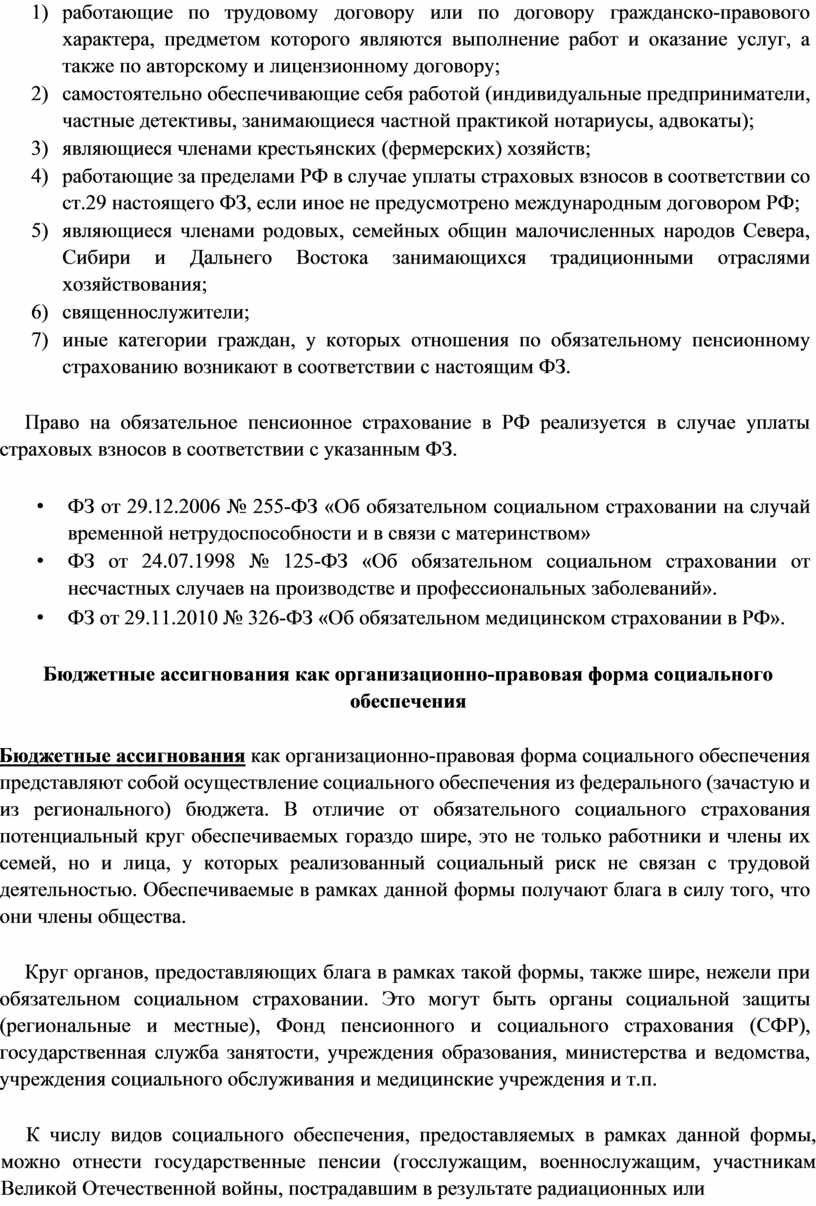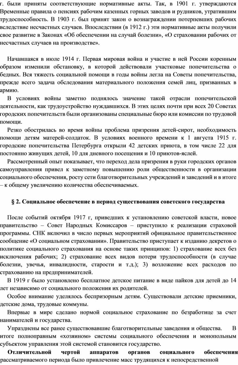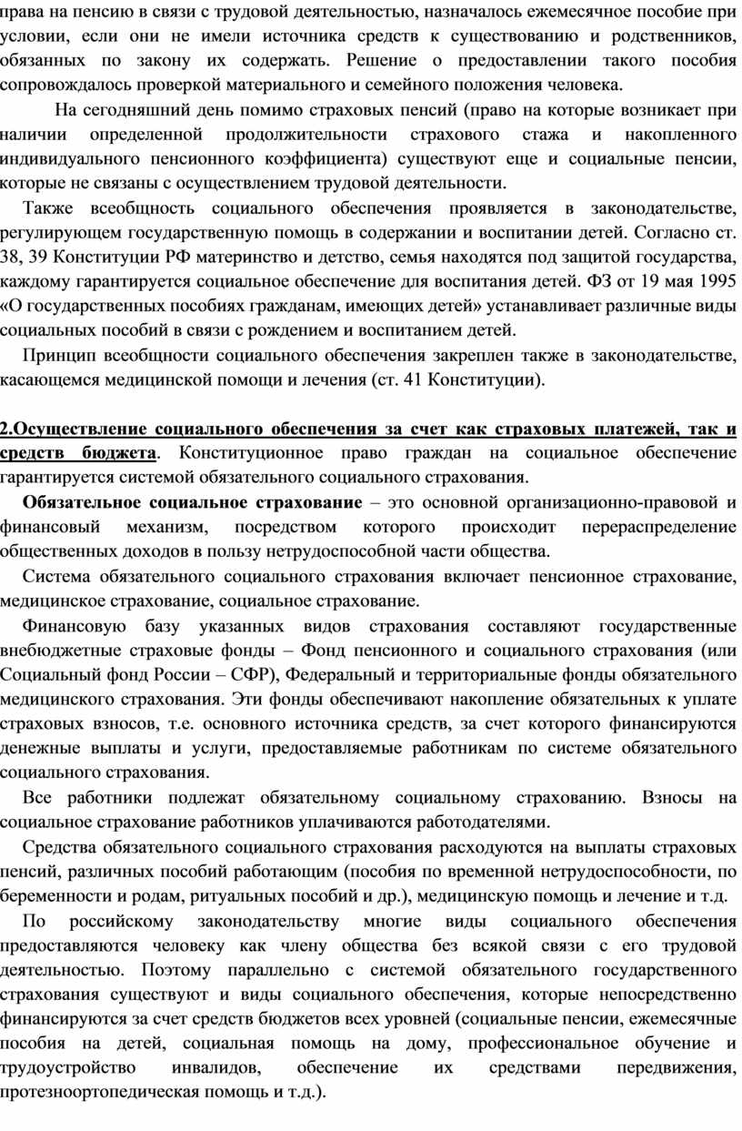 При советской власти социальное обеспечение сначала распространялось на всех лиц наемного труда (рабочих и служащих), а затем – на членов колхозов, детей, многодетные семьи, одиноких матерей. Наконец, нынешнее законодательство о социальном обеспечении России распространяется уже и на безработных, вынужденных переселенцев и беженцев, лиц, которые не имеют права на трудовую пенсию.