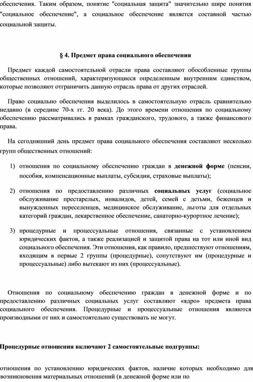 Отношения по социальному обеспечению граждан в денежной форме и по предоставлению различных социальных услуг составляют «ядро» предмета права социального обеспечения. Процедурные и процессуальные отношения являются производными от них и самостоятельно существовать не могут.