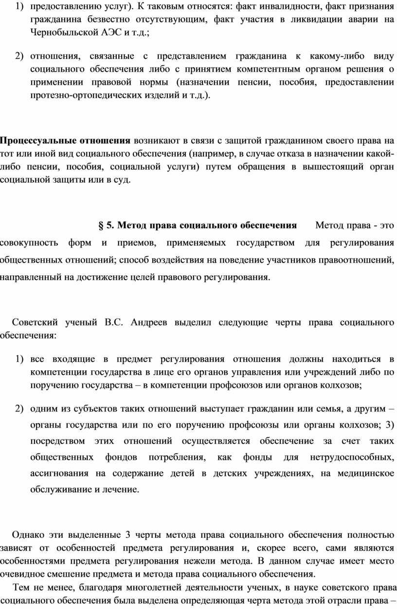 Советский ученый В.С. Андреев выделил следующие черты права социального обеспечения: