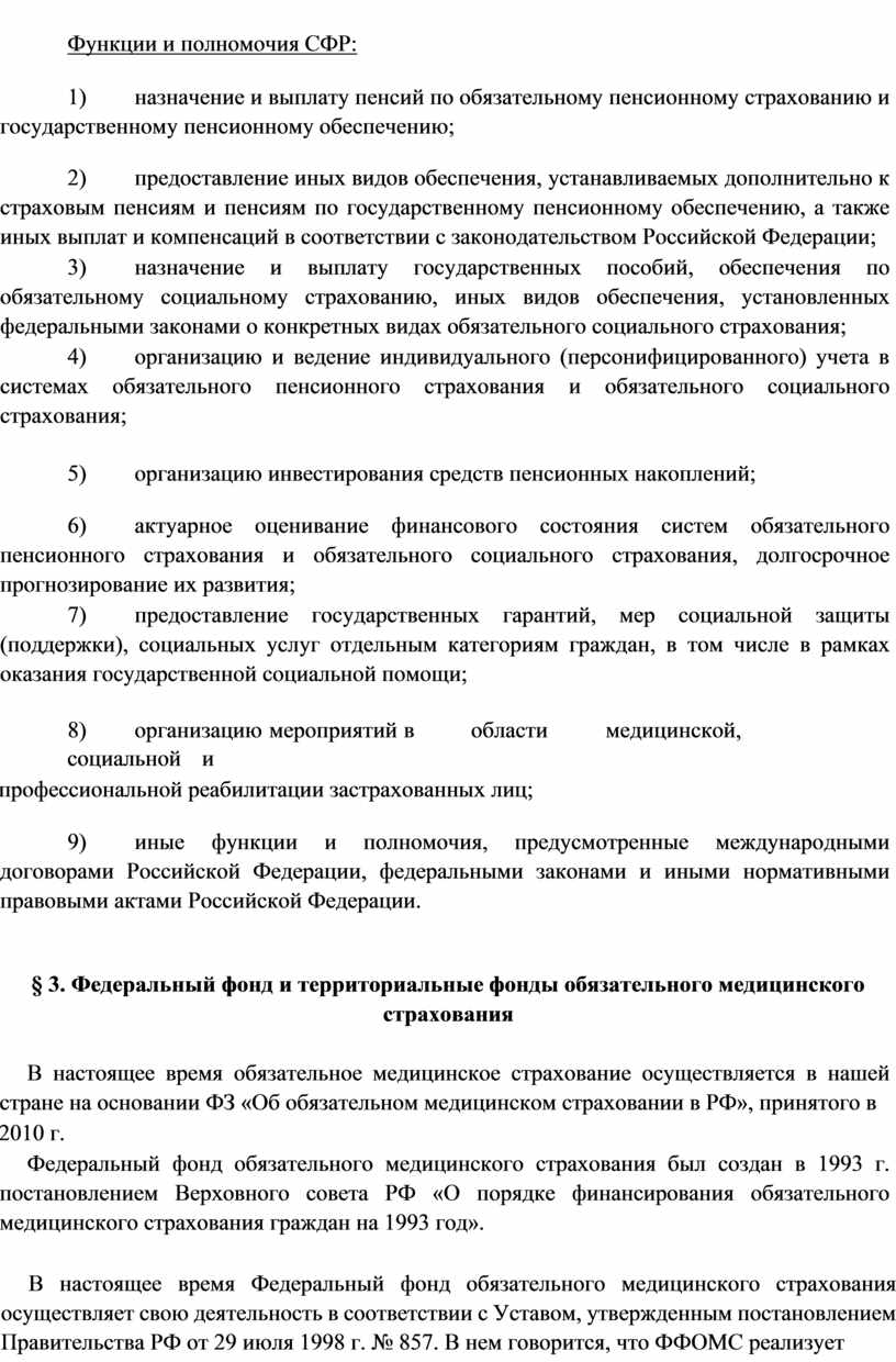 В настоящее время Федеральный фонд обязательного медицинского страхования осуществляет свою деятельность в соответствии с Уставом, утвержденным постановлением Правительства РФ от 29 июля 1998 г. № 857. В нем говорится, что ФФОМС реализует государственную политику в области обязательного медицинского страхования граждан как составной части государственного социального страхования; является самостоятельным государственным некоммерческим финансово-кредитным учреждением. Деятельность ФФОМС подотчетна Правительству РФ.