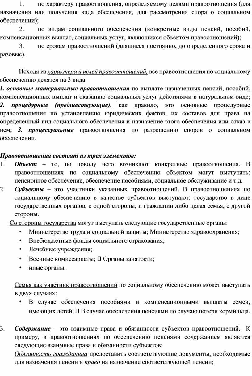Исходя из характера и целей правоотношений, все правоотношения по социальному обеспечению делятся на 3 вида: