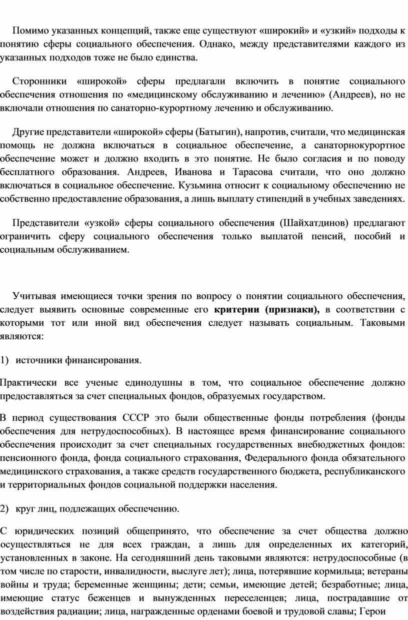 Представители «узкой» сферы социального обеспечения (Шайхатдинов) предлагают ограничить сферу социального обеспечения только выплатой пенсий, пособий и социальным обслуживанием.