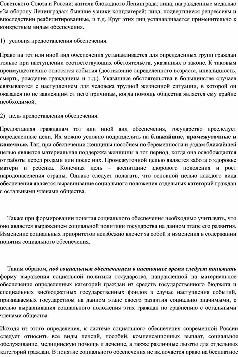 Предоставляя гражданам тот или иной вид обеспечения, государство преследует определенные цели. Их можно условно подразделить на ближайшие, промежуточные и конечные. Так, при обеспечении женщины пособием по беременности и родам ближайшей целью является материальная поддержка женщины в тот период, когда она освобождается от работы перед родами или после них. Промежуточной целью является забота о здоровье матери и ребенка. Конечная цель – воспитание здорового поколения и рост народонаселения страны. Однако следует полагать, что основной целью каждого вида обеспечения является выравнивание социального положения отдельных категорий граждан с остальными членами общества.