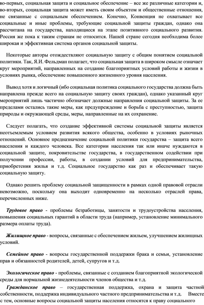 Некоторые авторы отождествляют социальную защиту с общим понятием социальной политики. Так, Я.И. Фельдман полагает, что социальная защита в широком смысле означает круг мероприятий, направленных на создание благоприятных условий работы и жизни в условиях рынка, обеспечение повышенного жизненного уровня населения.