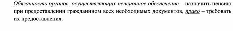 Обязанность органов, осуществляющих пенсионное обеспечение – назначить пенсию при предоставлении гражданином всех необходимых документов, право – требовать их предоставления.
