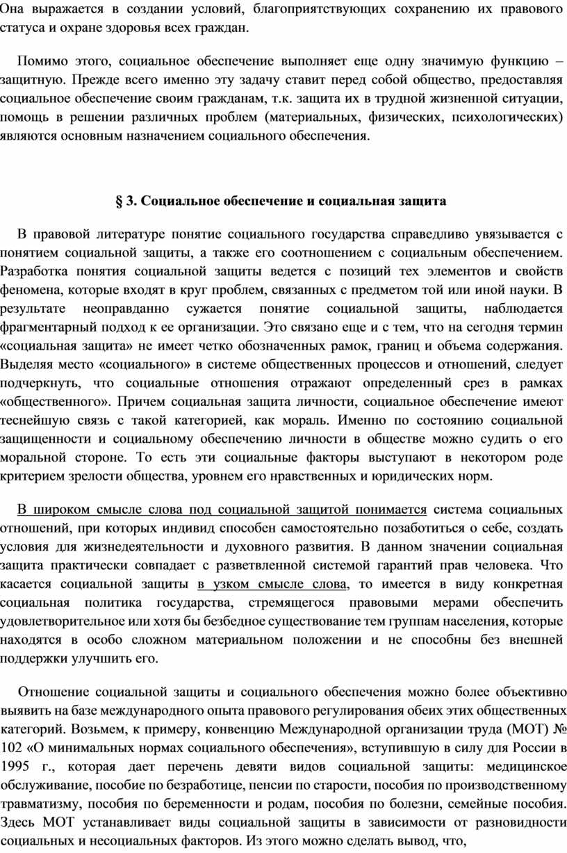 Отношение социальной защиты и социального обеспечения можно более объективно выявить на базе международного опыта правового регулирования обеих этих общественных категорий. Возьмем, к примеру, конвенцию Международной организации труда (МОТ) № 102 «О минимальных нормах социального обеспечения», вступившую в силу для России в 1995 г., которая дает перечень девяти видов социальной защиты: медицинское обслуживание, пособие по безработице, пенсии по старости, пособия по производственному травматизму, пособия по беременности и родам, пособия по болезни, семейные пособия. Здесь МОТ устанавливает виды социальной защиты в зависимости от разновидности социальных и несоциальных факторов. Из этого можно сделать вывод, что, во-первых, социальная защита и социальное обеспечение – все же различные категории и, во-вторых, социальная защита может иметь своим объектом и общественные отношения, не связанные с социальным обеспечением. Конечно, Конвенция не охватывает все социальные и иные проблемы, требующие социальной защиты граждан, однако она рассчитана на государства, находящиеся на этапе позитивного социального развития. Россия же пока к таким странам не относится. Нашей стране сегодня необходима более широкая и эффективная система органов социальной защиты.