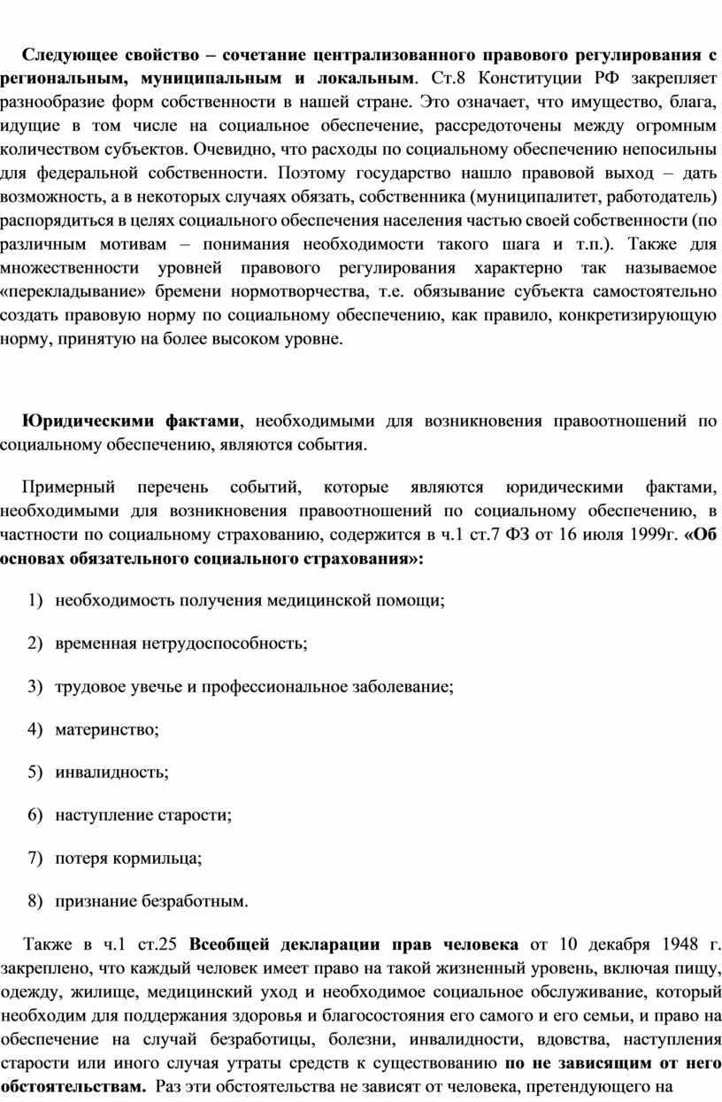 Следующее свойство – сочетание централизованного правового регулирования с региональным, муниципальным и локальным. Ст.8 Конституции РФ закрепляет разнообразие форм собственности в нашей стране. Это означает, что имущество, блага, идущие в том числе на социальное обеспечение, рассредоточены между огромным количеством субъектов. Очевидно, что расходы по социальному обеспечению непосильны для федеральной собственности. Поэтому государство нашло правовой выход – дать возможность, а в некоторых случаях обязать, собственника (муниципалитет, работодатель) распорядиться в целях социального обеспечения населения частью своей собственности (по различным мотивам – понимания необходимости такого шага и т.п.). Также для множественности уровней правового регулирования характерно так называемое «перекладывание» бремени нормотворчества, т.е. обязывание субъекта самостоятельно создать правовую норму по социальному обеспечению, как правило, конкретизирующую норму, принятую на более высоком уровне.
