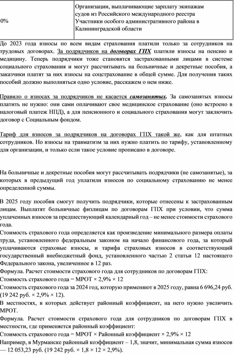 Формула. Расчет стоимости страхового года для сотрудников по договорам ГПХ в местности, где применяется районный коэффициент: