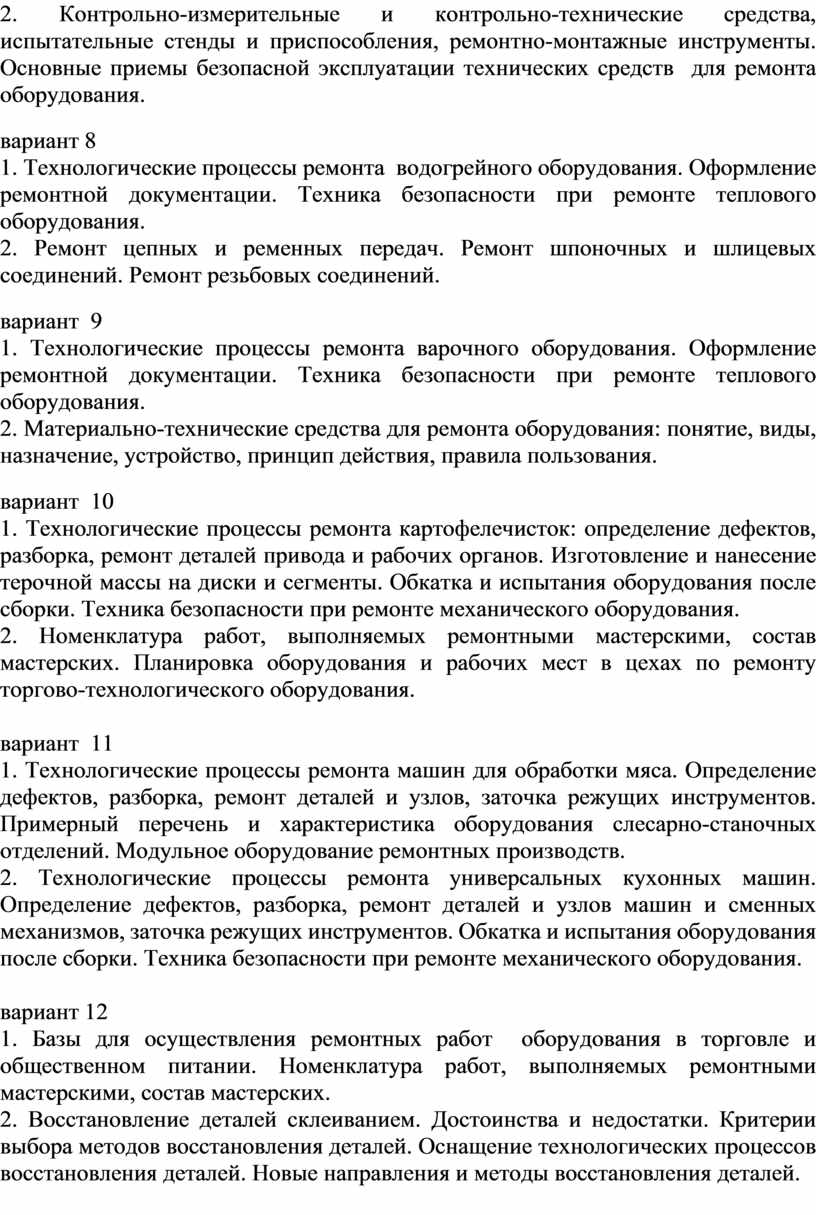1. Технологические процессы ремонта овощерезательных машин, машин для нарезки хлеба и гастрономических продуктов: определение дефектов, разборка, ремонт деталей, заточка режущих инструментов. Обкатка и испытания оборудования после сборки. Техника безопасности при ремонте механического оборудования.
