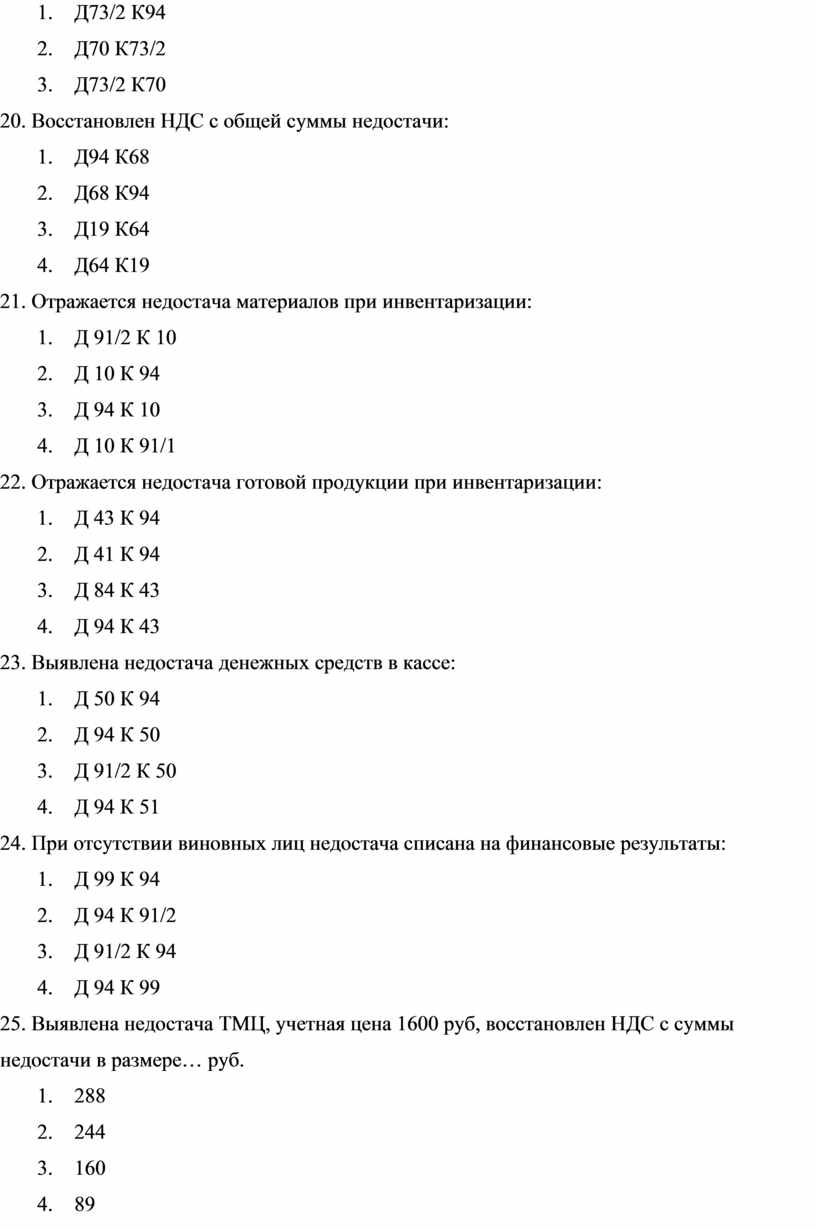 25. Выявлена недостача ТМЦ, учетная цена 1600 руб, восстановлен НДС с суммы недостачи в размере… руб.