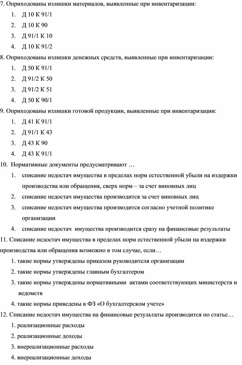 1. списание недостач имущества в пределах норм естественной убыли на издержки производства или обращения, сверх норм – за счет виновных лиц
