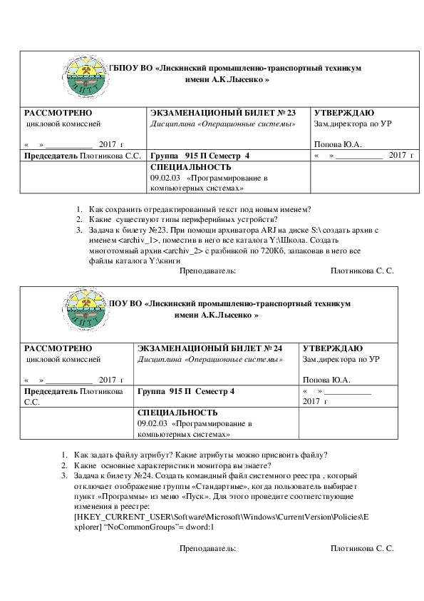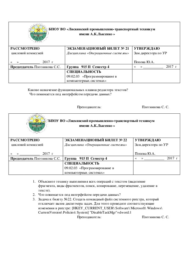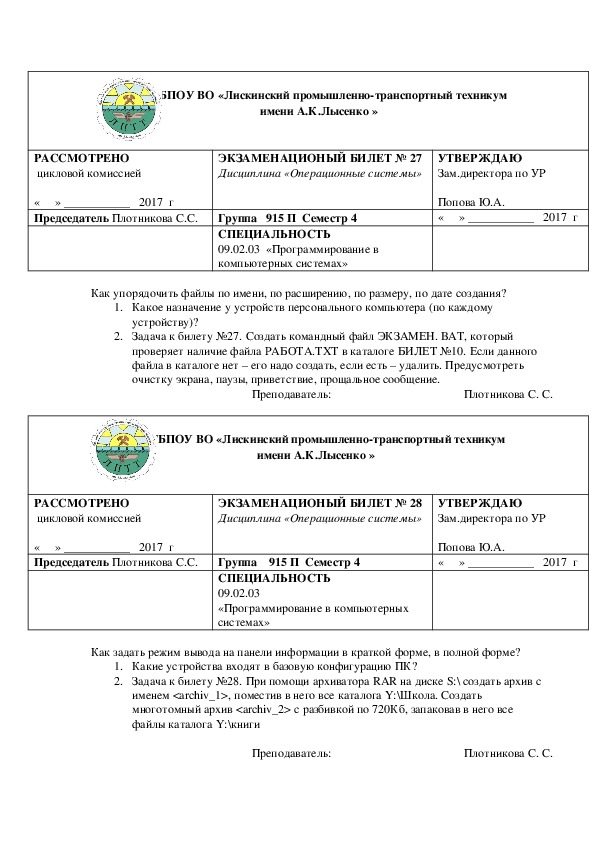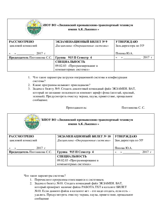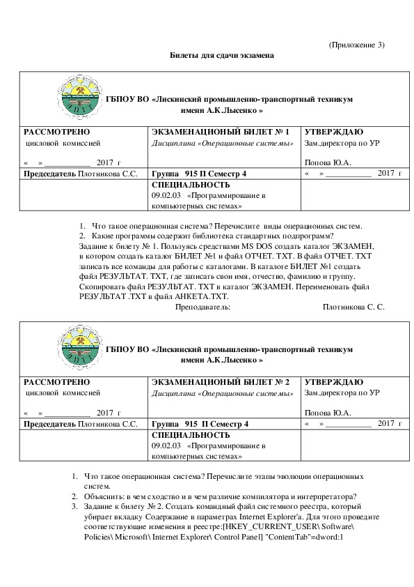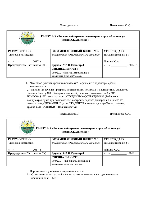 Плотникова Светлана Сергеевна, преподаватель.Комплект контрольно-оценочных средств по дисциплине ОП.01 «Операцион-ные системы» разработан на основе Федерального государственного образовательного стандарта (ФГОС) среднего профессионального образования (далее СПО) по специаль-ности 09.02.03 «Программирование в компьютерных системах».