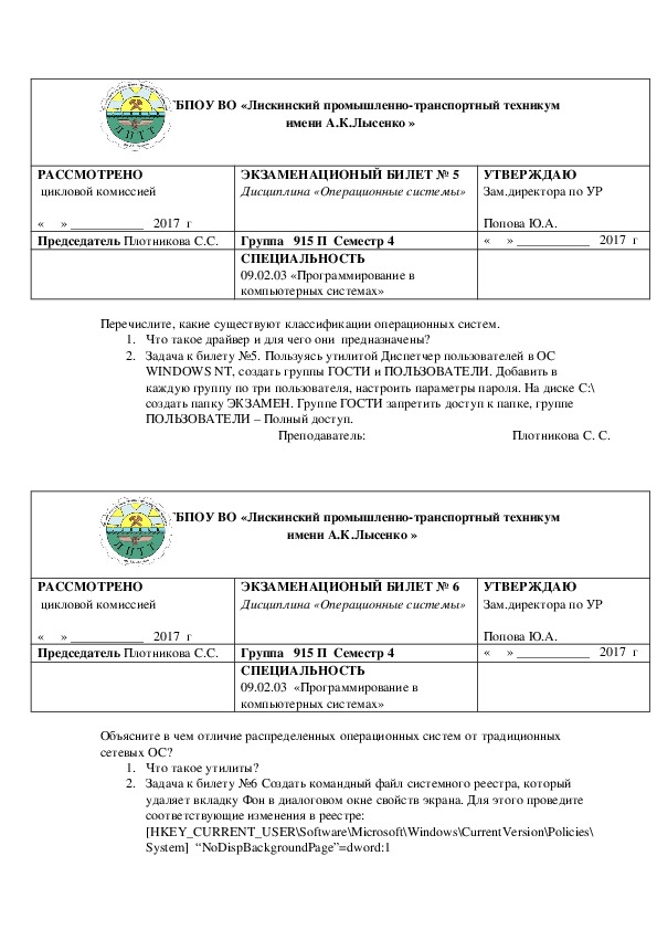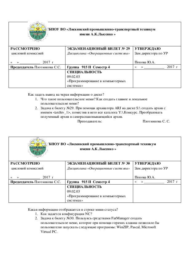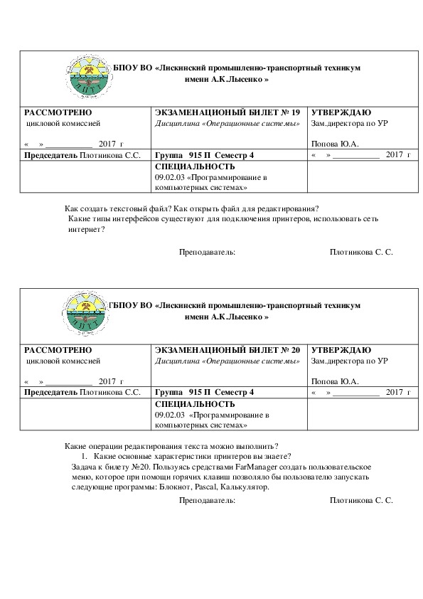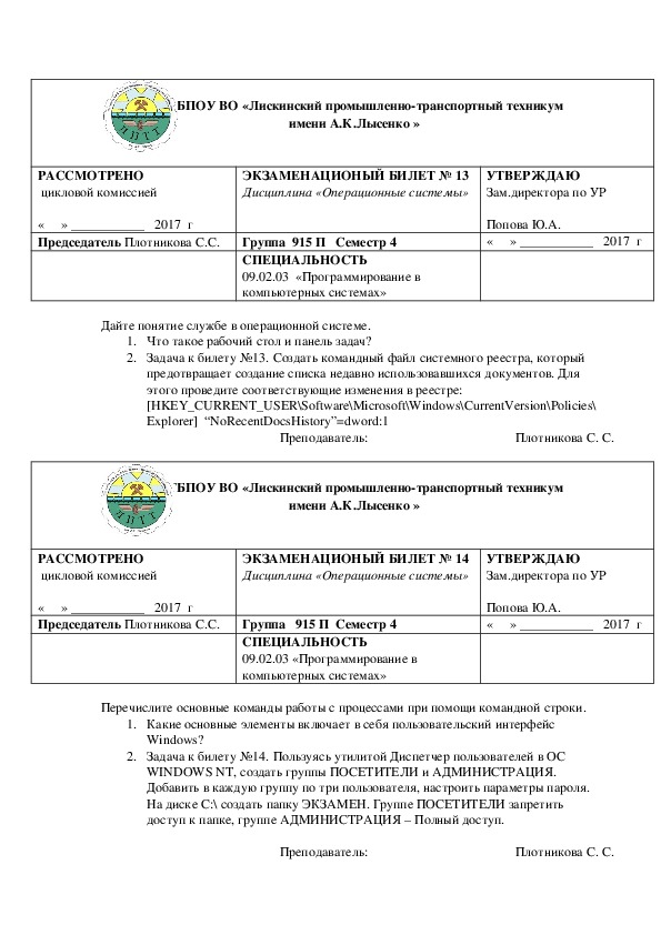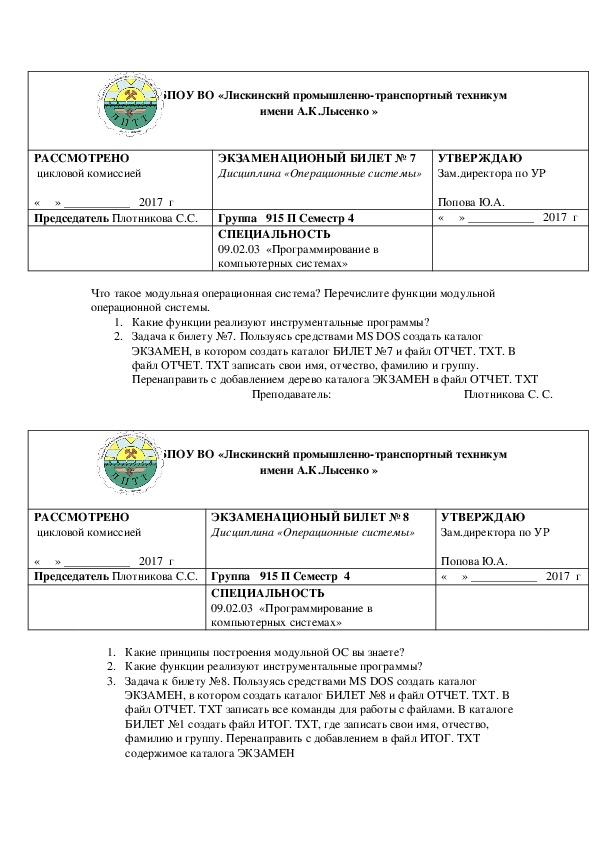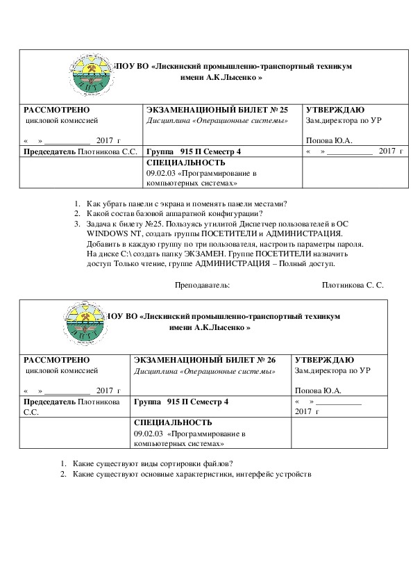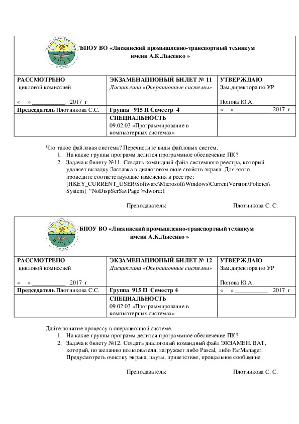 Плотникова Светлана Сергеевна, преподаватель.Комплект контрольно-оценочных средств по дисциплине ОП.01 «Операцион-ные системы» разработан на основе Федерального государственного образовательного стандарта (ФГОС) среднего профессионального образования (далее СПО) по специаль-ности 09.02.03 «Программирование в компьютерных системах».