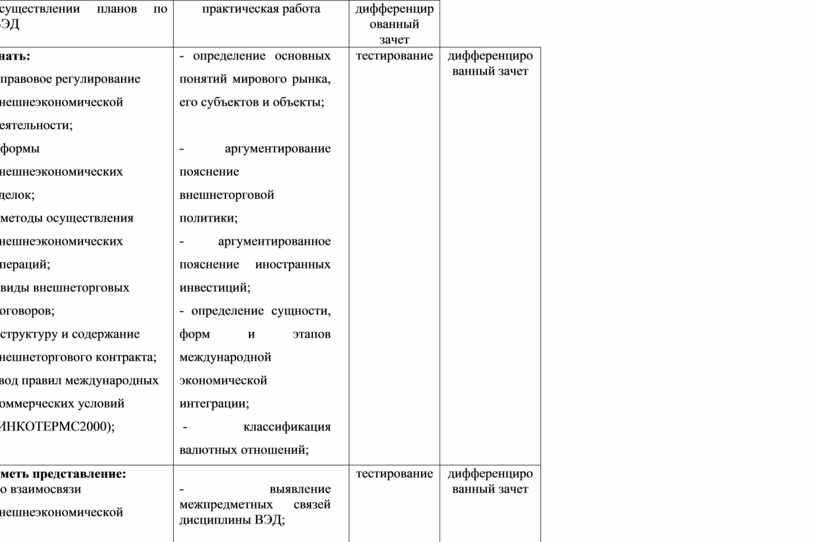 - аргументированное пояснение правовых норм регулирования внешнеэкономической деятельностью; - классификация форм внешнеэкономических сделок; - определение методов осуществления внешнеэкономических операций;