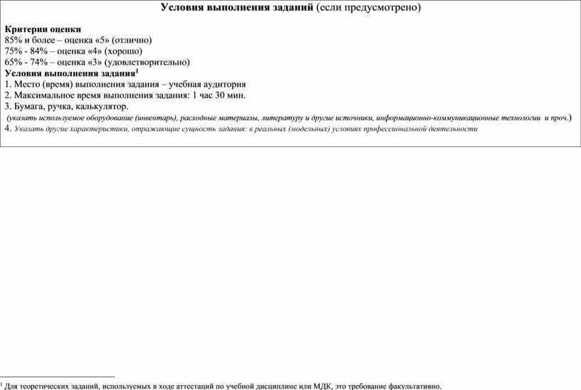 Критерии оценки 85% и более – оценка «5» (отлично) 75% - 84% – оценка «4» (хорошо) 65% - 74% – оценка «3» (удовлетворительно) Условия выполнения задания[7] 1. Место (время) выполнения задания – учебная аудитория 2. Максимальное время выполнения задания: 1 час 30 мин. 3. Бумага, ручка, калькулятор. (указать используемое оборудование (инвентарь), расходные материалы, литературу и другие источники, информационно-коммуникационные технологии и проч.) 4. Указать другие характеристики, отражающие сущность задания: в реальных (модельных) условиях профессиональной деятельности