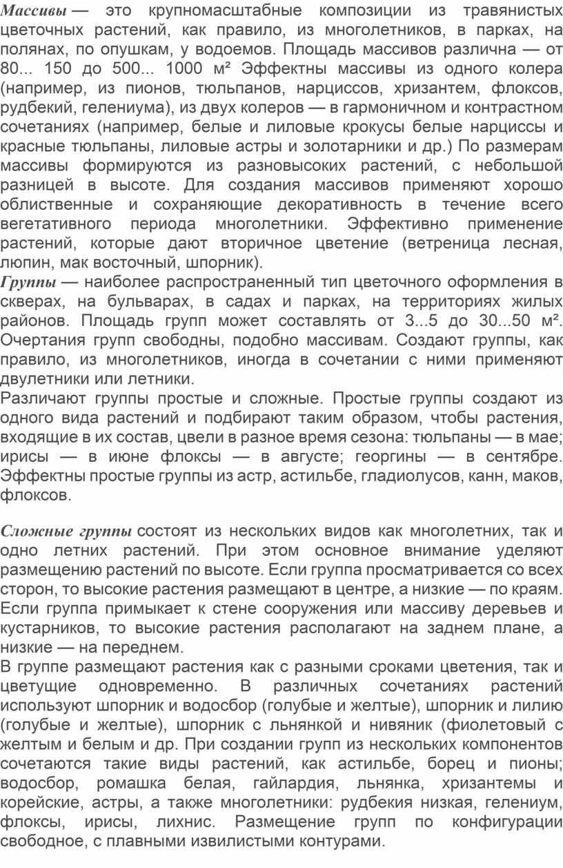 Массивы — это крупномасштабные композиции из травянистых цветочных растений, как правило, из многолетников, в парках, на полянах, по опушкам, у водоемов. Площадь массивов различна — от 80... 150 до 500... 1000 м² Эффектны массивы из одного колера (например, из пионов, тюльпанов, нарциссов, хризантем, флоксов, рудбекий, гелениума), из двух колеров — в гармоничном и контрастном сочетаниях (например, белые и лиловые крокусы белые нарциссы и красные тюльпаны, лиловые астры и золотарники и др.) По размерам массивы формируются из разновысоких растений, с небольшой разницей в высоте. Для создания массивов применяют хорошо облиственные и сохраняющие декоративность в течение всего вегетативного периода многолетники. Эффективно применение растений, которые дают вторичное цветение (ветреница лесная, люпин, мак восточный, шпорник).
