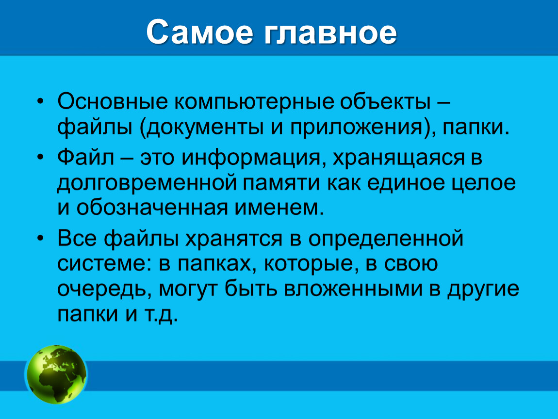 Основные компьютерные объекты – файлы (документы и приложения), папки.