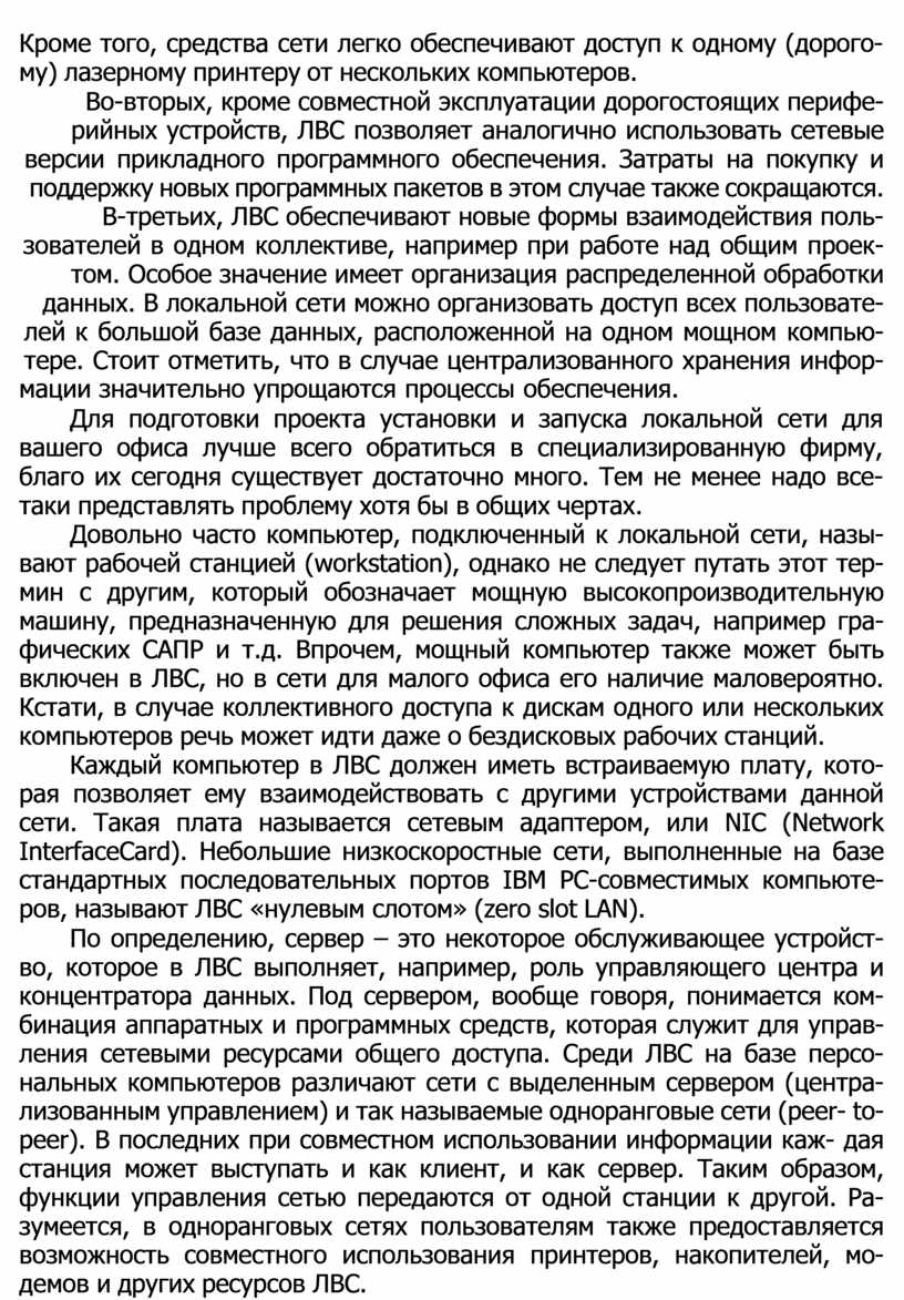 Под локальной вычислительной сетью (ЛВС) обычно понимают коммуникационную систему, состоящую из двух или более компьютеров и включающую в себя специальное аппаратное и программное обеспе- чение. В такой системе любое из подключенных устройств может ис- пользовать ЛВС для передачи или получения информации. Небольшие ЛВС, или LAN (Local Area Network), обычно охватывают какое-либо от- деление предприятия и не выходят за пределы одного здания. Доста- точно эффективно можно использовать ЛВС и в малом офисе. Стоит, видимо, перечислить ряд веских причин для объединения отдельных персональных компьютеров в ЛВС.