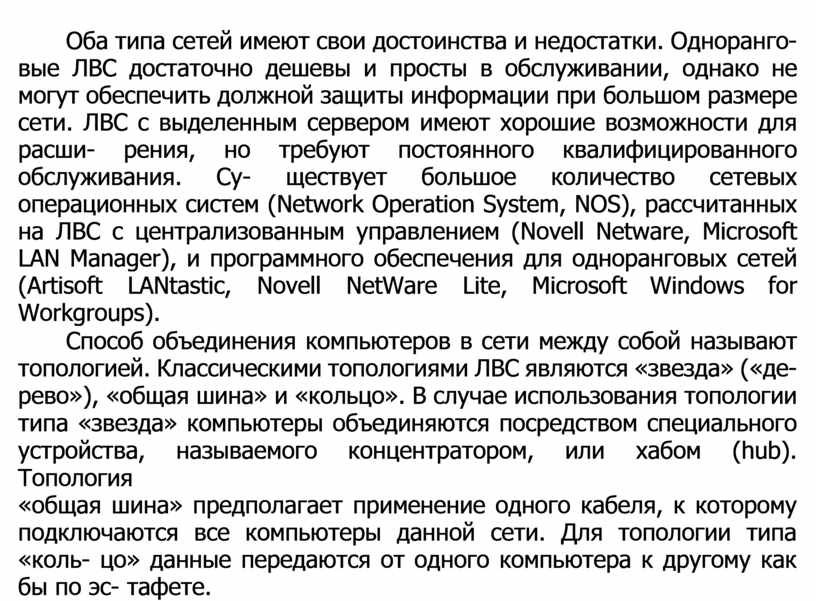 Оба типа сетей имеют свои достоинства и недостатки. Одноранго- вые ЛВС достаточно дешевы и просты в обслуживании, однако не могут обеспечить должной защиты информации при большом размере сети. ЛВС с выделенным сервером имеют хорошие возможности для расши- рения, но требуют постоянного квалифицированного обслуживания. Су- ществует большое количество сетевых операционных систем (Network Operation System, NOS), рассчитанных на ЛВС с централизованным управлением (Novell Netware, Microsoft LAN Manager), и программного обеспечения для одноранговых сетей (Artisoft LANtastic, Novell NetWare Lite, Microsoft Windows for Workgroups).