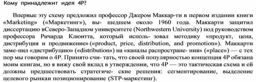 Впервые эту схему предложил профессор Джером Маккар ти в первом издании книги «Marketing» («Маркетинг»), вы шедшем около 1960 года. Маккарти защитил диссертацию в Северо-Западном университете (Northwestern University) под руководством профессора Ричарда Клюитта, который исполь зовал методику «продукт, цена, дистрибуция и продвижение» («product, price, distribution, and promotion»). Маккарти заме нил «дистрибуцию» («distribution») на «каналы распростране ния» («place») — с тех пор мы говорим о 4Р. Принято счи тать, что своей популярностью концепция 4Р обязана моим книгам, но я вижу свой вклад в утверждении, что 4Р — это тактическая схема и ей должны предшествовать стратегиче ские решения: сегментирование, выделение целевого рынка и позиционирование (STP-маркетинг).