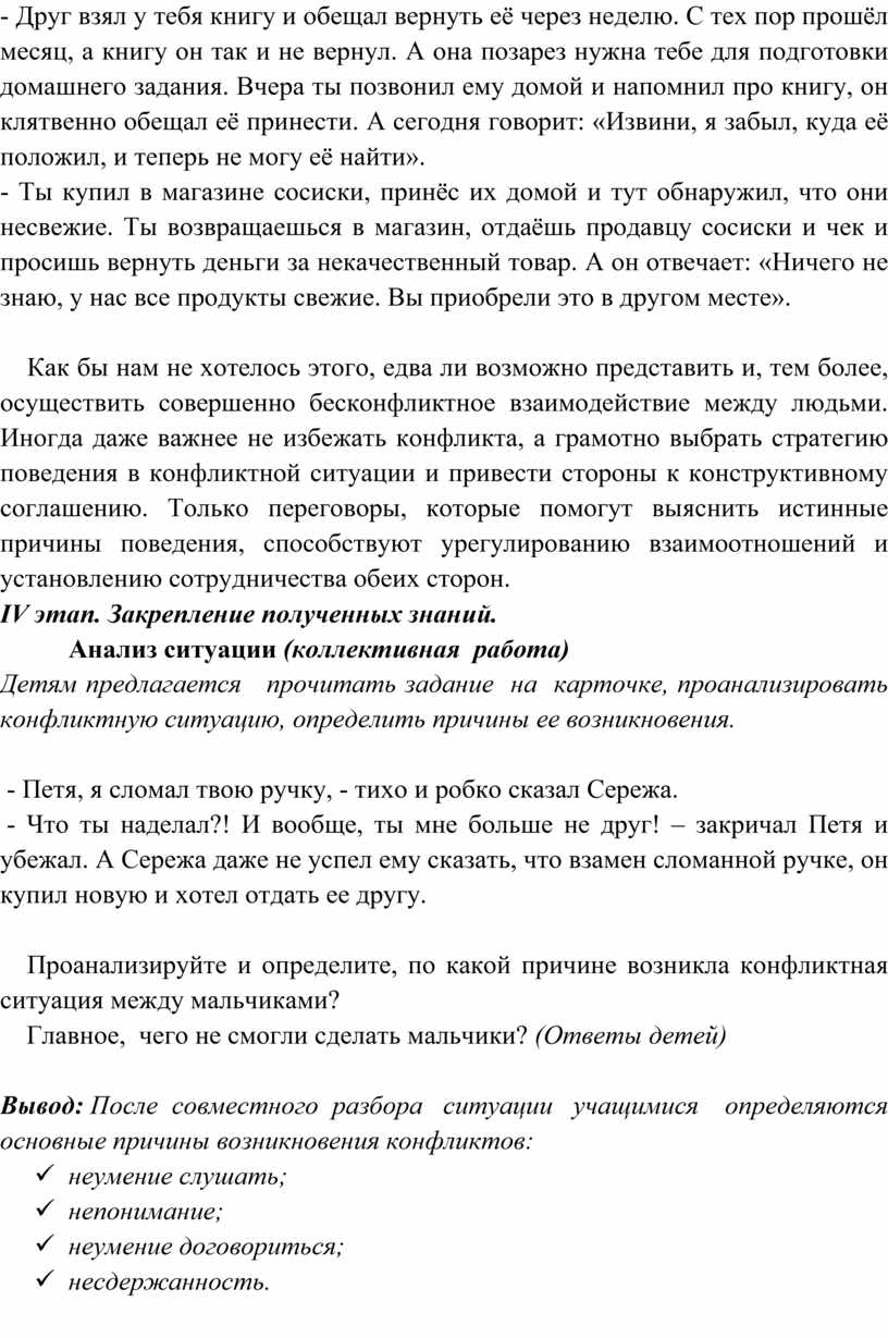 Вывод: После совместного разбора ситуации учащимися определяются основные причины возникновения конфликтов: