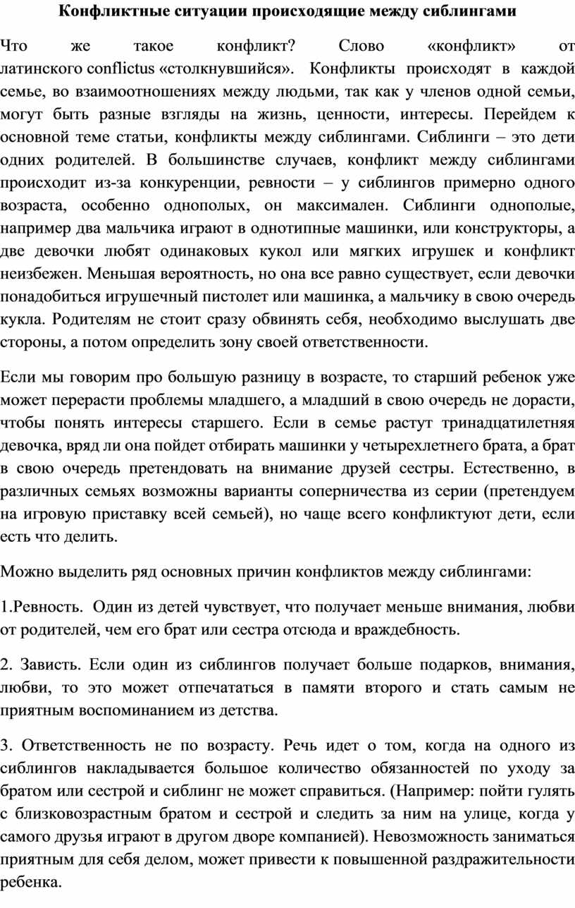 Что же такое конфликт? Слово «конфликт» от латинского conflictus «столкнувшийся». Конфликты происходят в каждой семье, во взаимоотношениях между людьми, так как у членов одной семьи, могут быть разные взгляды на жизнь, ценности, интересы. Перейдем к основной теме статьи, конфликты между сиблингами. Сиблинги – это дети одних родителей. В большинстве случаев, конфликт между сиблингами происходит из-за конкуренции, ревности – у сиблингов примерно одного возраста, особенно однополых, он максимален. Сиблинги однополые, например два мальчика играют в однотипные машинки, или конструкторы, а две девочки любят одинаковых кукол или мягких игрушек и конфликт неизбежен. Меньшая вероятность, но она все равно существует, если девочки понадобиться игрушечный пистолет или машинка, а мальчику в свою очередь кукла. Родителям не стоит сразу обвинять себя, необходимо выслушать две стороны, а потом определить зону своей ответственности.