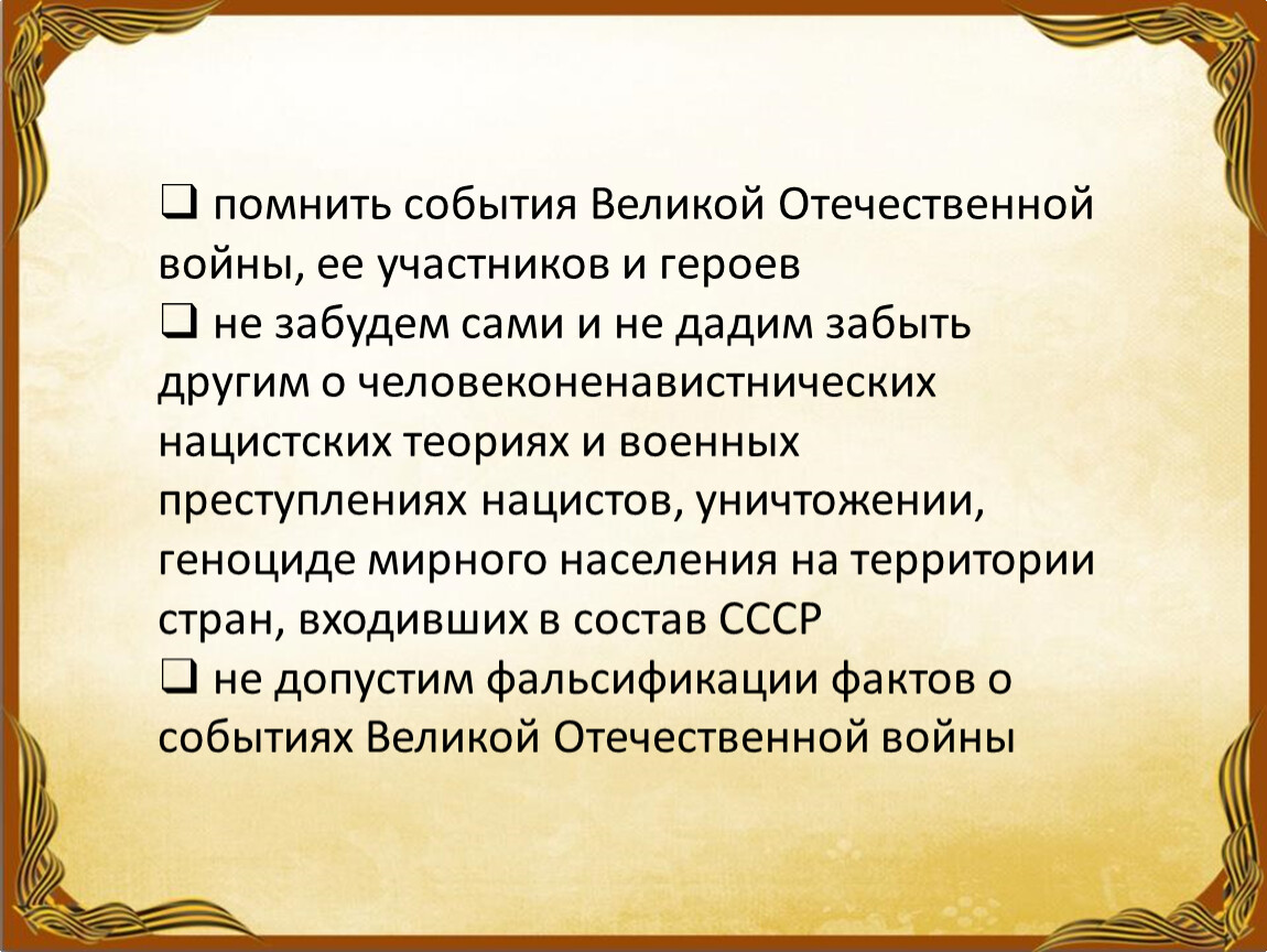 ❑ не забудем сами и не дадим забыть другим о человеконенавистнических нацистских теориях и военных преступлениях нацистов, уничтожении,