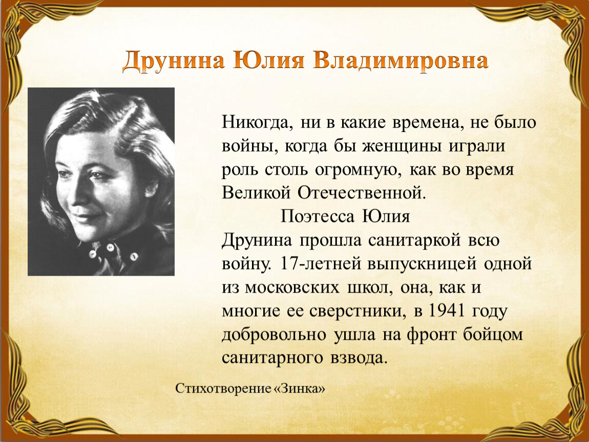 Никогда, ни в какие времена, не было войны, когда бы женщины играли роль столь огромную, как во время Великой Отечественной. Поэтесса Юлия Друнина прошла санитаркой всю войну. 17-летней выпускницей одной из московских школ, она, как и многие ее сверстники, в 1941 году добровольно ушла на фронт бойцом санитарного взвода.