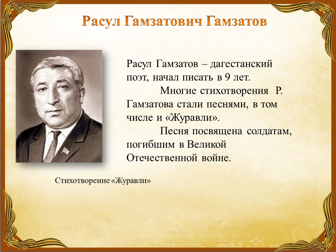 Расул Гамзатов – дагестанский поэт, начал писать в 9 лет. Многие стихотворения Р. Гамзатова стали песнями, в том числе и «Журавли». Песня посвящена солдатам, погибшим в Великой Отечественной войне.