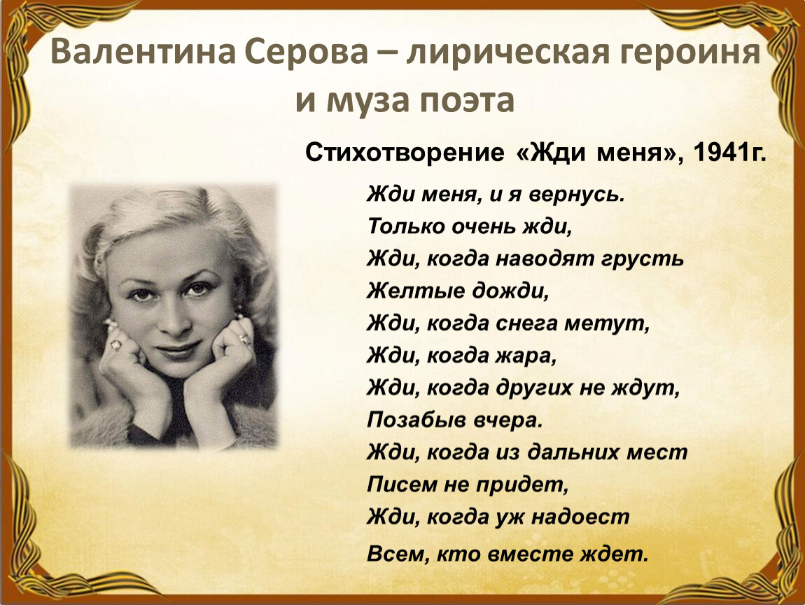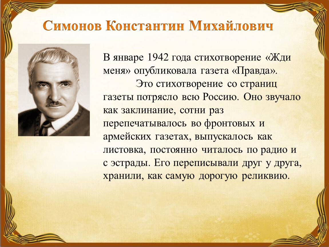 В январе 1942 года стихотворение «Жди меня» опубликовала газета «Правда». Это стихотворение со страниц газеты потрясло всю Россию. Оно звучало как заклинание, сотни раз перепечатывалось во фронтовых и армейских газетах, выпускалось как листовка, постоянно читалось по радио и с эстрады. Его переписывали друг у друга, хранили, как самую дорогую реликвию.