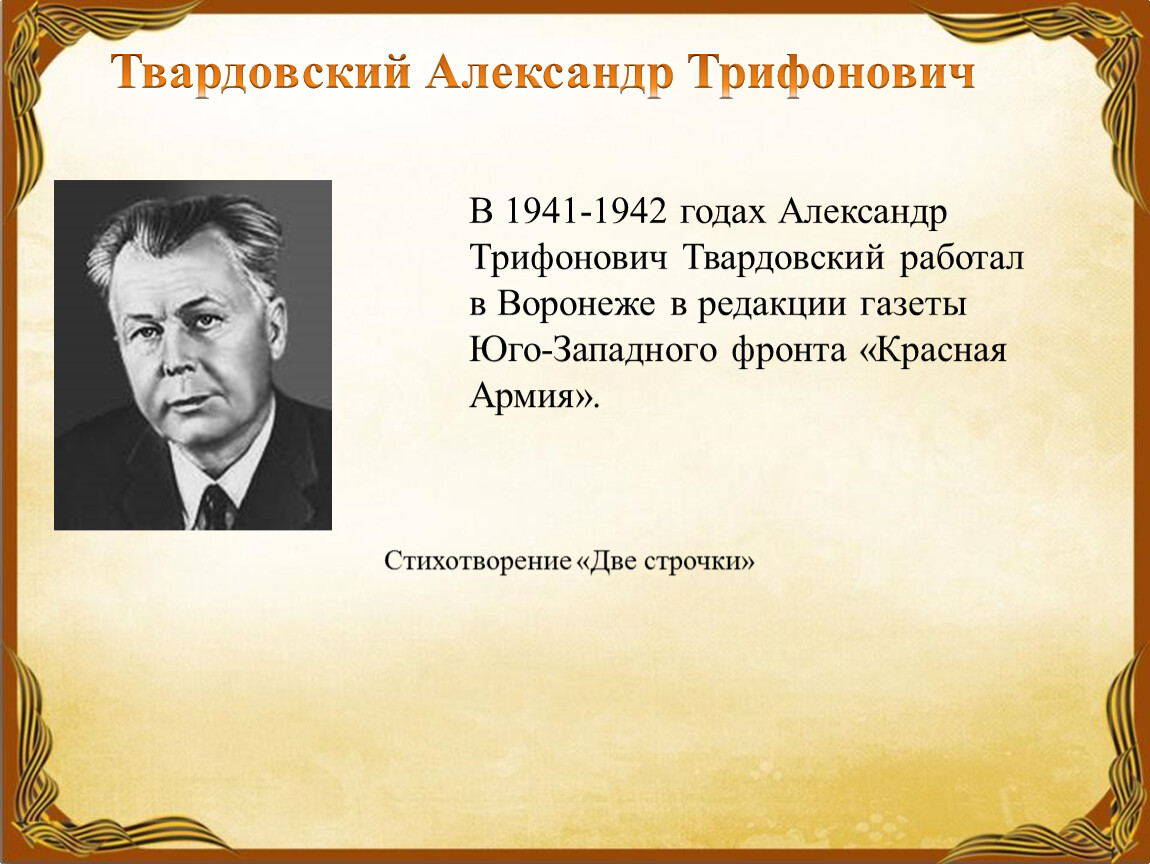 В 1941-1942 годах Александр Трифонович Твардовский работал в Воронеже в редакции газеты Юго-Западного фронта «Красная Армия».