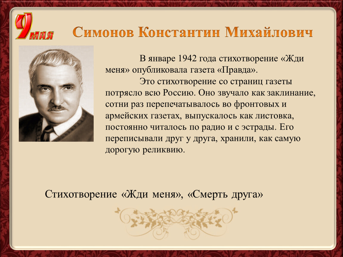 В январе 1942 года стихотворение «Жди меня» опубликовала газета «Правда». Это стихотворение со страниц газеты потрясло всю Россию. Оно звучало как заклинание, сотни раз перепечатывалось во фронтовых и армейских газетах, выпускалось как листовка, постоянно читалось по радио и с эстрады. Его переписывали друг у друга, хранили, как самую дорогую реликвию.