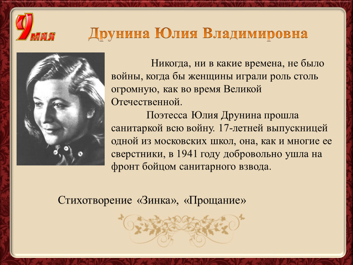 Никогда, ни в какие времена, не было войны, когда бы женщины играли роль столь огромную, как во время Великой Отечественной. Поэтесса Юлия Друнина прошла санитаркой всю войну. 17-летней выпускницей одной из московских школ, она, как и многие ее сверстники, в 1941 году добровольно ушла на фронт бойцом санитарного взвода.