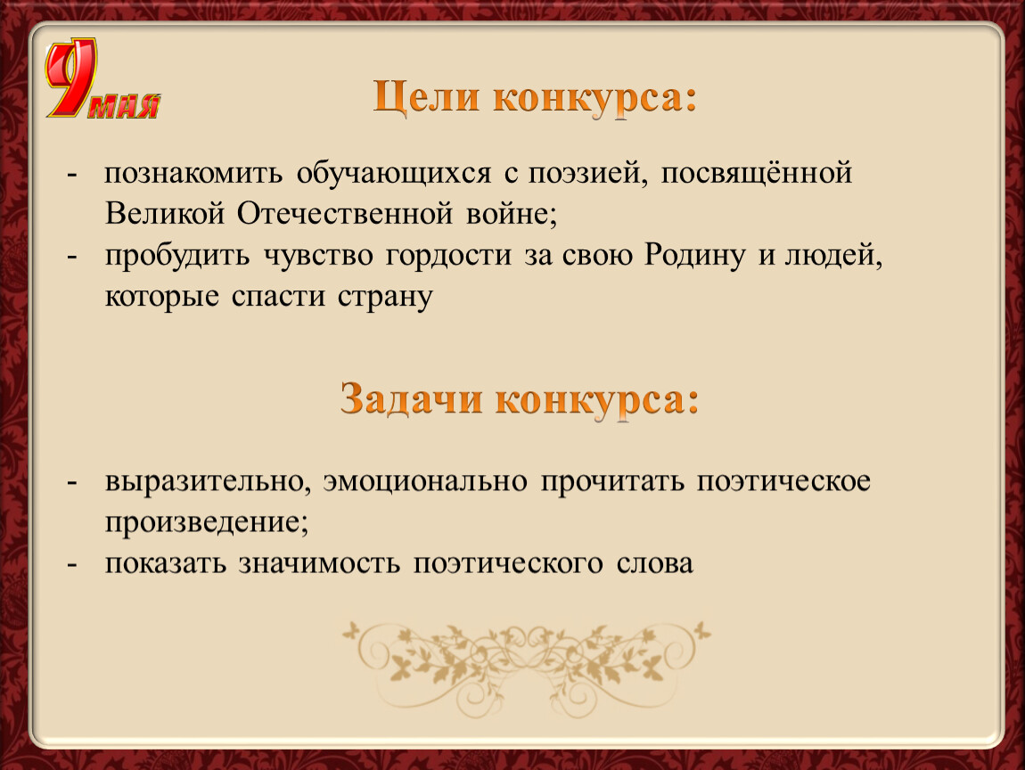 -   познакомить обучающихся с поэзией, посвящённой Великой Отечественной войне;