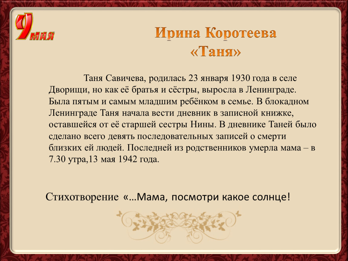 Таня Савичева, родилась 23 января 1930 года в селе Дворищи, но как её братья и сёстры, выросла в Ленинграде. Была пятым и самым младшим ребёнком в семье. В блокадном Ленинграде Таня начала вести дневник в записной книжке, оставшейся от её старшей сестры Нины. В дневнике Таней было сделано всего девять последовательных записей о смерти близких ей людей. Последней из родственников умерла мама – в 7.30 утра,13 мая 1942 года.