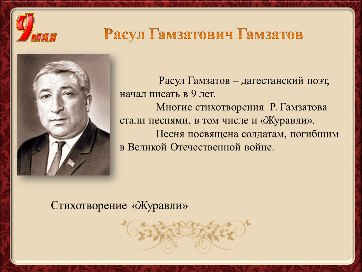 Расул Гамзатов – дагестанский поэт, начал писать в 9 лет. Многие стихотворения Р. Гамзатова стали песнями, в том числе и «Журавли». Песня посвящена солдатам, погибшим в Великой Отечественной войне.