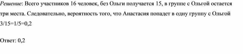 Решение: Всего участников 16 человек, без Ольги получается 15, в группе с Ольгой остается три места. Следовательно, вероятность того, что Анастасия попадет в одну группу с Ольгой 3/15=1/5=0,2