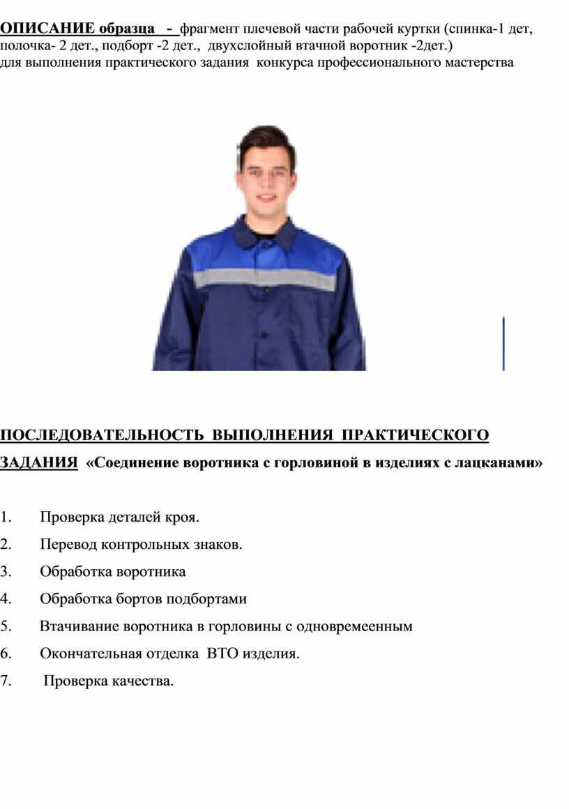 Конкурсанты выполняют образец по обработке воротника и втачивания его в горловину тема «Соединение воротника с горловиной в изделиях с лацканами». Выкройки, технический рисунок и описание выполнения образца прилагаются. Приветствуется творческий подход. Время выполнения – 3 ч. 30 мин. Используемое оборудование: швейные машины «Veritas» IL-5590, Промышленная швейная машина Jack JK-F4, специальные машины 51 - А класса, оборудование для ВТО утюг с индивидуальным парогенератором, промышленная 5-ниточная стачивающе-обметочная машина JUCK JK-757 (оверлог).