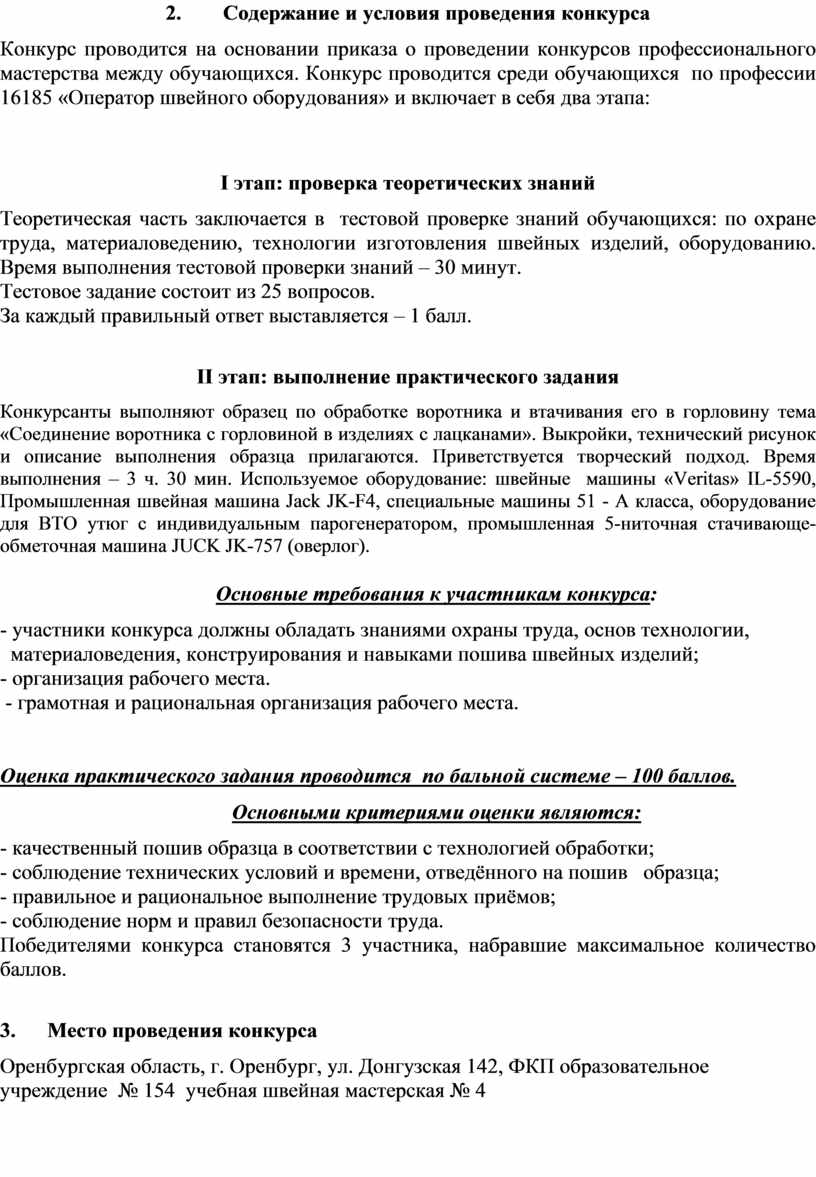 Конкурс проводится на основании приказа о проведении конкурсов профессионального мастерства между обучающихся. Конкурс проводится среди обучающихся по профессии 16185 «Оператор швейного оборудования» и включает в себя два этапа: