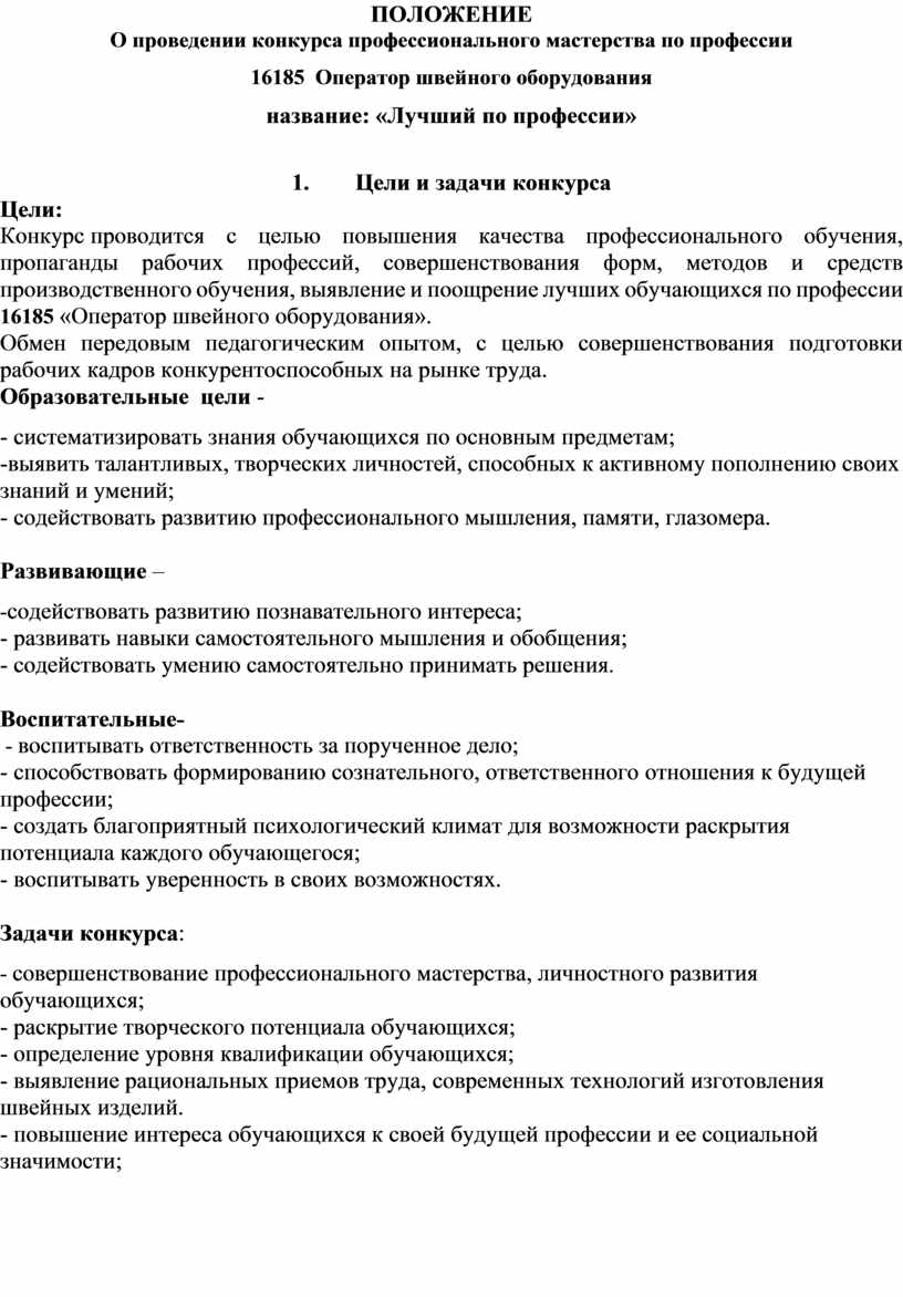 Конкурс проводится с целью повышения качества профессионального обучения, пропаганды рабочих профессий, совершенствования форм, методов и средств производственного обучения, выявление и поощрение лучших обучающихся по профессии 16185 «Оператор швейного оборудования».