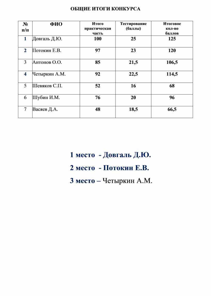 1 место - Довгаль Д.Ю. 2 место - Потокин Е.В. 3 место – Четыркин А.М.