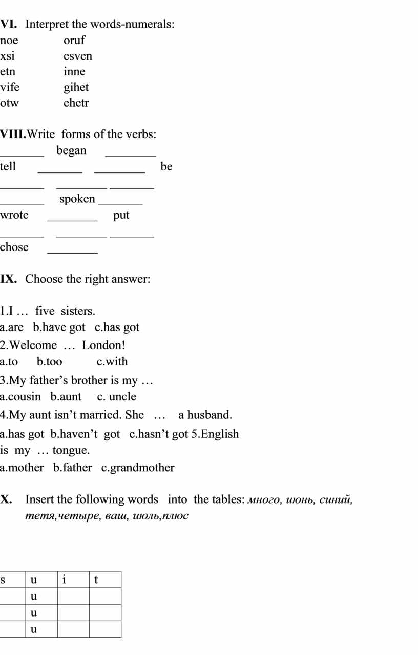 VIII.Write forms of the verbs: _______ began ________ tell _______ ________ be _______ ________ _______ _______ spoken _______ wrote ________ put _______ ________ _______ chose ________