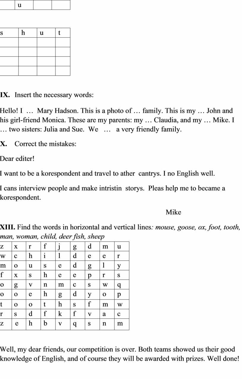 XIII. Find the words in horizontal and vertical lines: mouse, goose, ox, foot, tooth, man, woman, child, deer fish, sheep