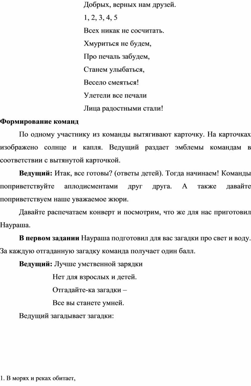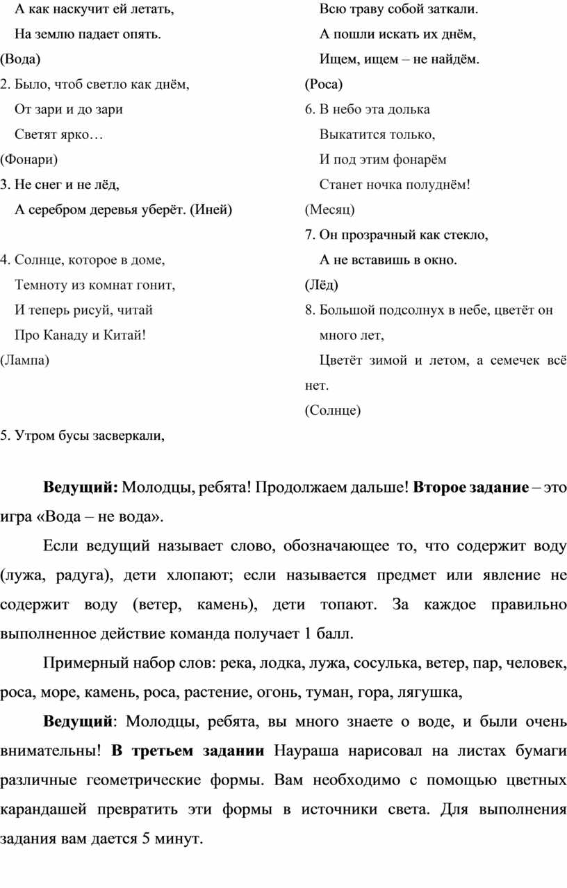 В первом задании Наураша подготовил для вас загадки про свет и воду. За каждую отгаданную загадку команда получает один балл.