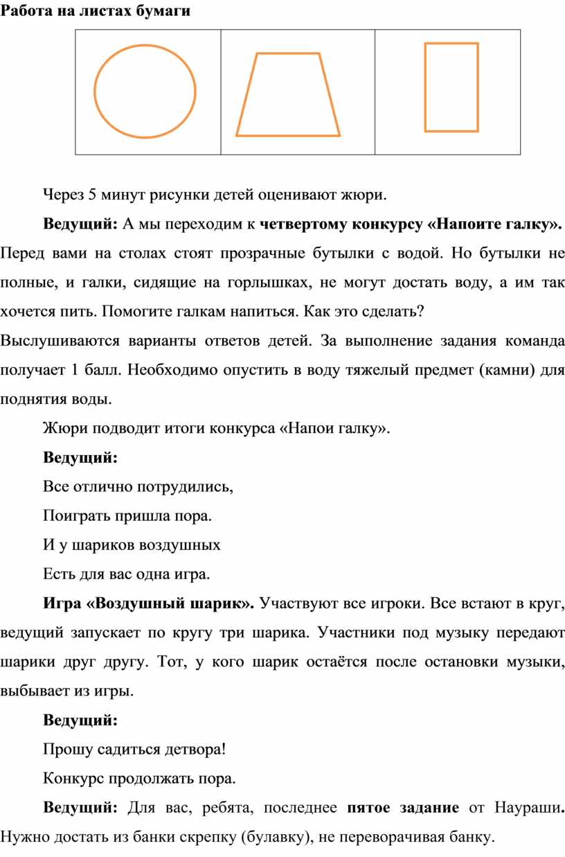 Ведущий: Молодцы, ребята, вы много знаете о воде, и были очень внимательны! В третьем задании Наураша нарисовал на листах бумаги различные геометрические формы. Вам необходимо с помощью цветных карандашей превратить эти формы в источники света. Для выполнения задания вам дается 5 минут.